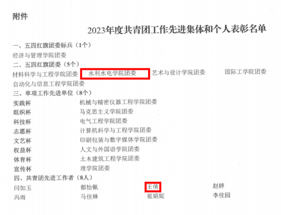 近日,共青团西安理工大学委员会印发《关于表彰2023年度先进集体和个人的决定》,pp电子团委荣获“2023年西安理工大学五四红旗团委”称号,学院团委书记王倩获“2023年西安理工大学共青团先进工作者”称号,水工201等五个团支部荣获“五四红旗团支部”,叶旭获“优秀共青团员标兵”、刘悦等91人获“优秀共青团员”,顾晓蕾等71人获“优秀共青团干部”。