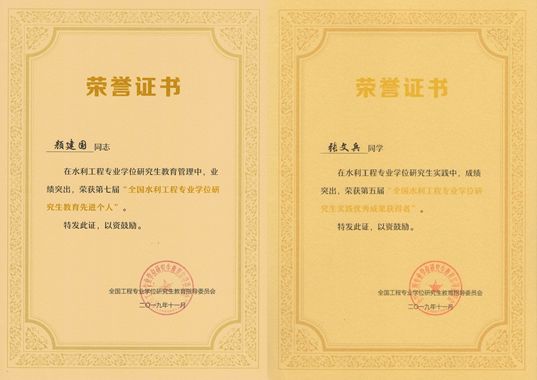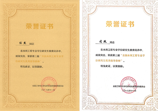 为更好地总结、交流水利工程专业学位研究生指导经验,提升导师指导能力,构建高水平“双师型”指导团队,不断提高培养质量,经个人申报、学校推荐、水利工程领域核心组成员和专家投票、教指委审定,pp电子pp电子官方网站任杰和司政2位老师荣获第三届“全国水利工程专业学位研究生优秀指导教师”;颜建国老师荣获第七届“全国水利工程专业学位研究生教育先进个人”;2016级水利工程专业学位硕士研究生张文兵 (指导教师:任杰副教授)荣获第五届“全国水利工程专业学位研究生实践优秀成果获得者”等荣誉称号。