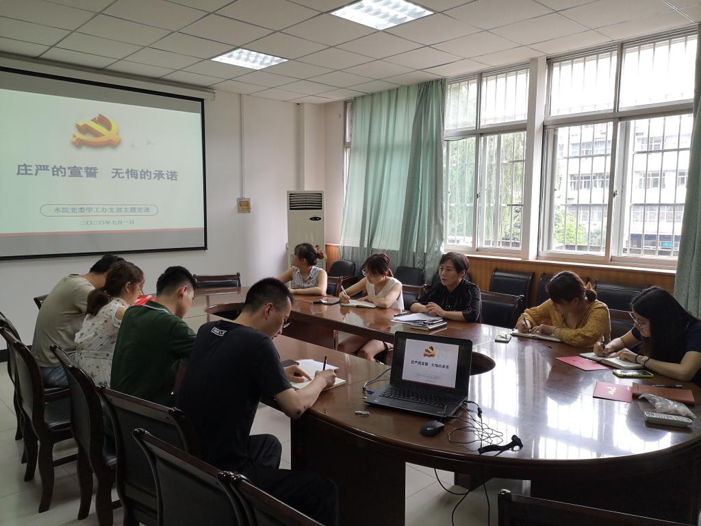 7月1日下午,pp电子官方网站学工办党支部在教四楼207会议室开展了题为“庄严的宣誓、无悔的承诺”的主题党课学习。党课由院党委副书记、副院长李红英主讲,支部全体党员参加学习。