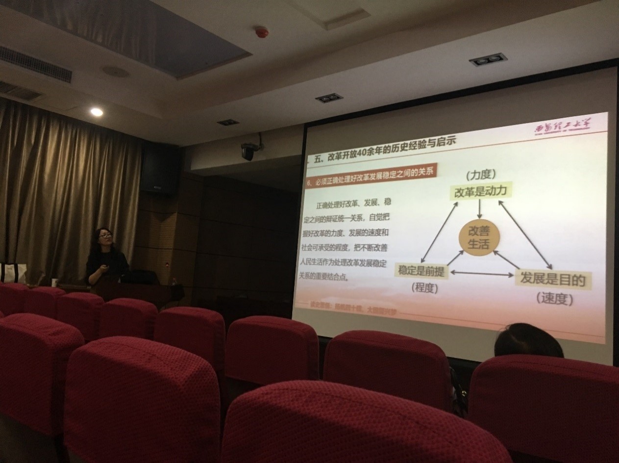 尹洁教授以杜润生、董明珠、路遥、长征六号团队等4个典型的改革创新人物故事开篇,从改革开放的历史前奏、酝酿起步、继续深化与新时代改革开放、40年的辉煌成就、历史经验与启示等5部分进行了生动讲述。从水电学院沈冰教授的个人事迹,到改革开放后高考恢复,从《发展相册—改革开放40年之人民生活》、《平凡的世界》等经典影视记录片段,到全面脱贫攻坚、开辟中国特色社会主义道路,引导教职工对改革开放史的思考,领悟发展的辉煌成就。通过深入浅出的讲解,与现场教职工一起回顾波澜壮阔的“改革开放”历程,帮助大家更加牢固的树立中国特色社会主义的道路自信、理论自信、制度自信和文化自信。