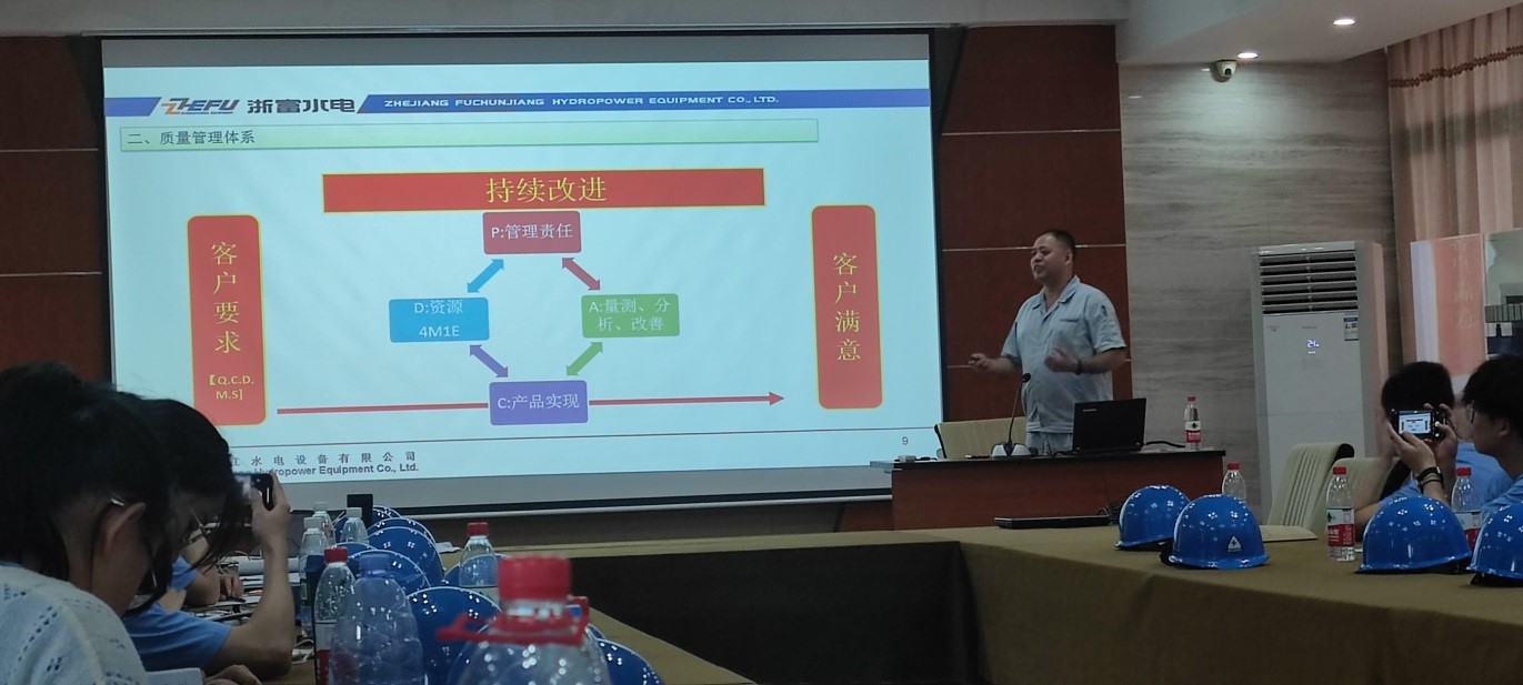 接下来,实习学生分为八个组,轮流深入工厂的各班组、各部门和富安水力机械研究所进行深入学习。通过深入班组实习,实习学生看到了很多书本和课堂中学到的水轮机、发电机各部件的实物,看到了“大国工匠”制造“大国重器”各部件的过程,了解了这些部件从下料、焊接、加工,到装配及试验的全部生产过程及相关技术和工艺,学习了各主要部件在各生产环节的检验项目、检验标准和检验方法,树立了质量是企业的生命的意识。