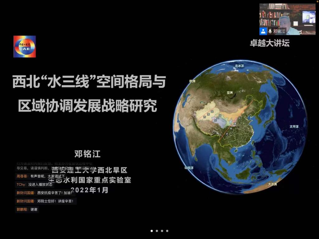 1月18日下午,pp电子官方网站线上上举办了“卓越大讲坛·对话院士”报告会,中国工程院院士邓铭江作了题为“西北‘水三线’空间格局与区域协调发展战略”的报告,中电建西北院、中铁隧道局、天津大学等兄弟高校师生、水利行业专家、学者700余人参加了此次报告会。