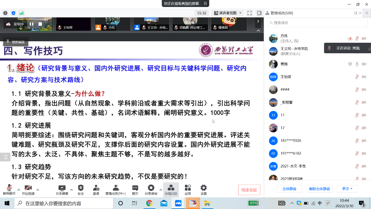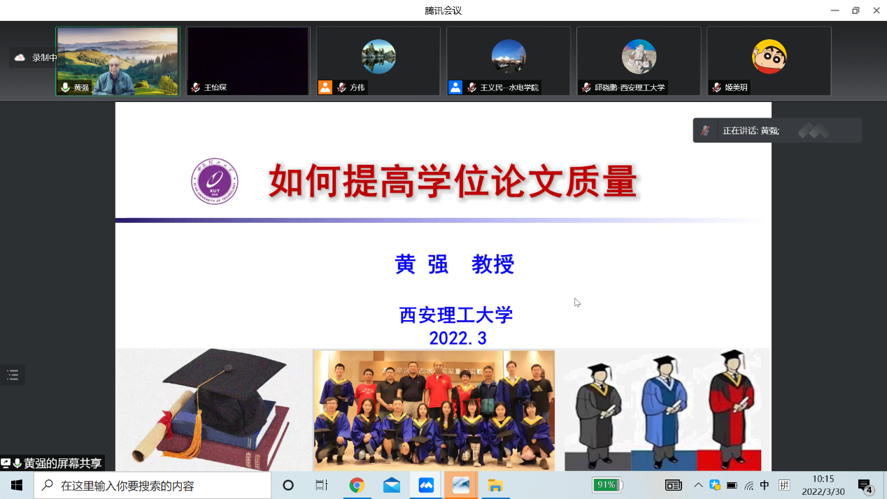 2022年是pp电子研究生学位论文质量提升年,学院高度重视,并规划了系列学术活动。2022年3月30日上午,学院特邀请了国家万人计划教学名师黄强教授作题为《如何提高学位论文质量》的专题讲座(线上形式)。讲座由pp电子官方网站副院长王义民教授主持,学院部分中青年教师、博硕士研究生共500余人参加。