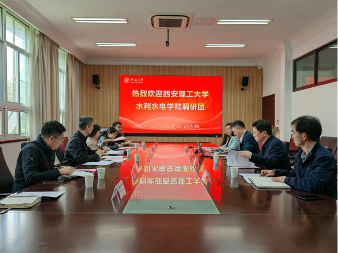 为进一步深化教育教学改革,提升本科人才培养质量,全面推进水文与水资源工程专业2024版培养方案修订工作,4月12日,西安理工大学pp电子官方网站水文水资源系副主任刘登峰、教师代表汪妮、杨元园、李婧、李蓝君和张林一行6人组成调研组,前往河海大学水文水资源学院开展本科培养方案修订专题调研。河海大学水文水资源学院党委书记石朋、副院长吴志勇、副院长任黎和水文水资源实验中心主任王万杰与调研组一行人在河海大学水文水资源学院进行了交流座谈。