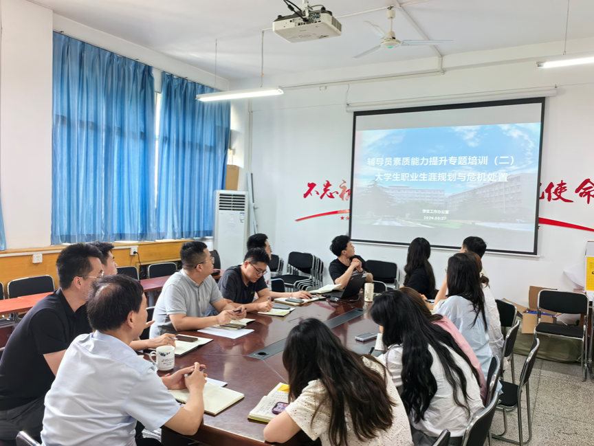 5月27日,pp电子官方网站学工办党支部在教四楼党员活动室开展辅导员素质能力提升专题培训之大学生职业生涯规划与危机事件处置专题培训。本次培训由pp电子官方网站学工党支部书记、办主任杨帆主讲。