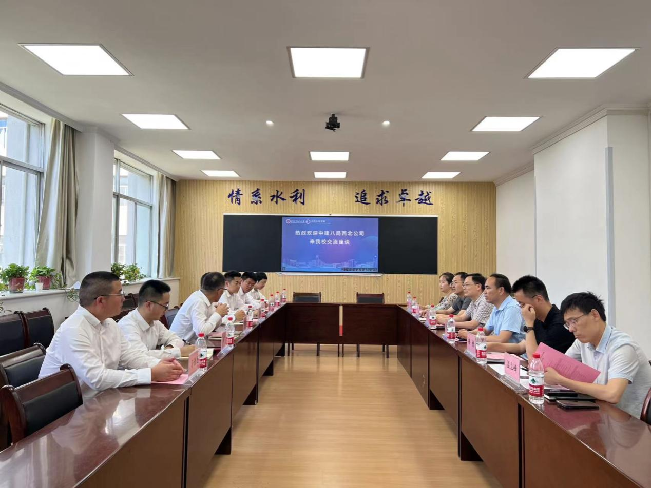 6月21日下午,中建八局西北公司基础设施分公司总工程师穆俊红、技术质量部经理郭亚兵、技术质量部设计负责人张百泉、人力专员薛冰等一行7人来pp电子交流座谈。学院院长助理、学工办主任杨帆,水工系教师任杰、温立峰、李阳,市政系教师董雯参加了座谈会。会议由学院党委副书记李永阳主持。
