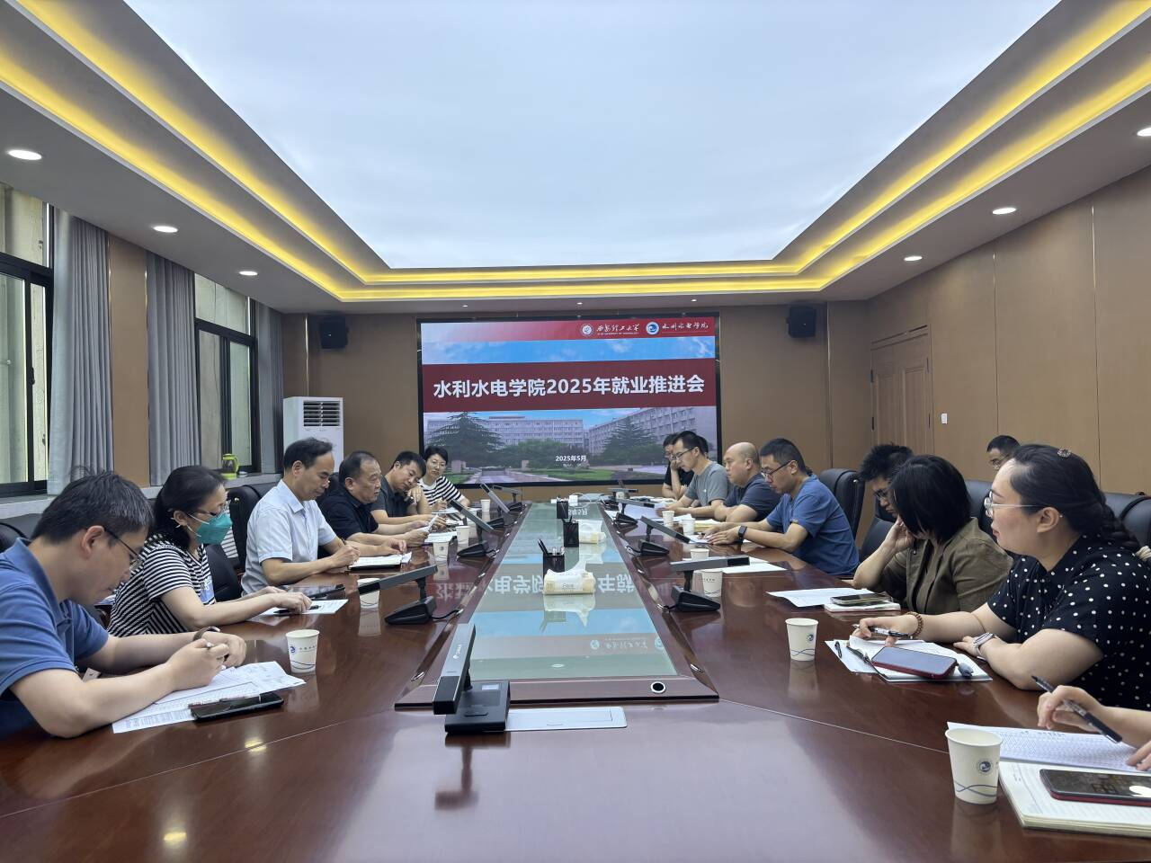杨帆汇报了学院2025届毕业生基本情况以及当前就业落实情况,分析各专业就业率、升学率及未就业学生情况。