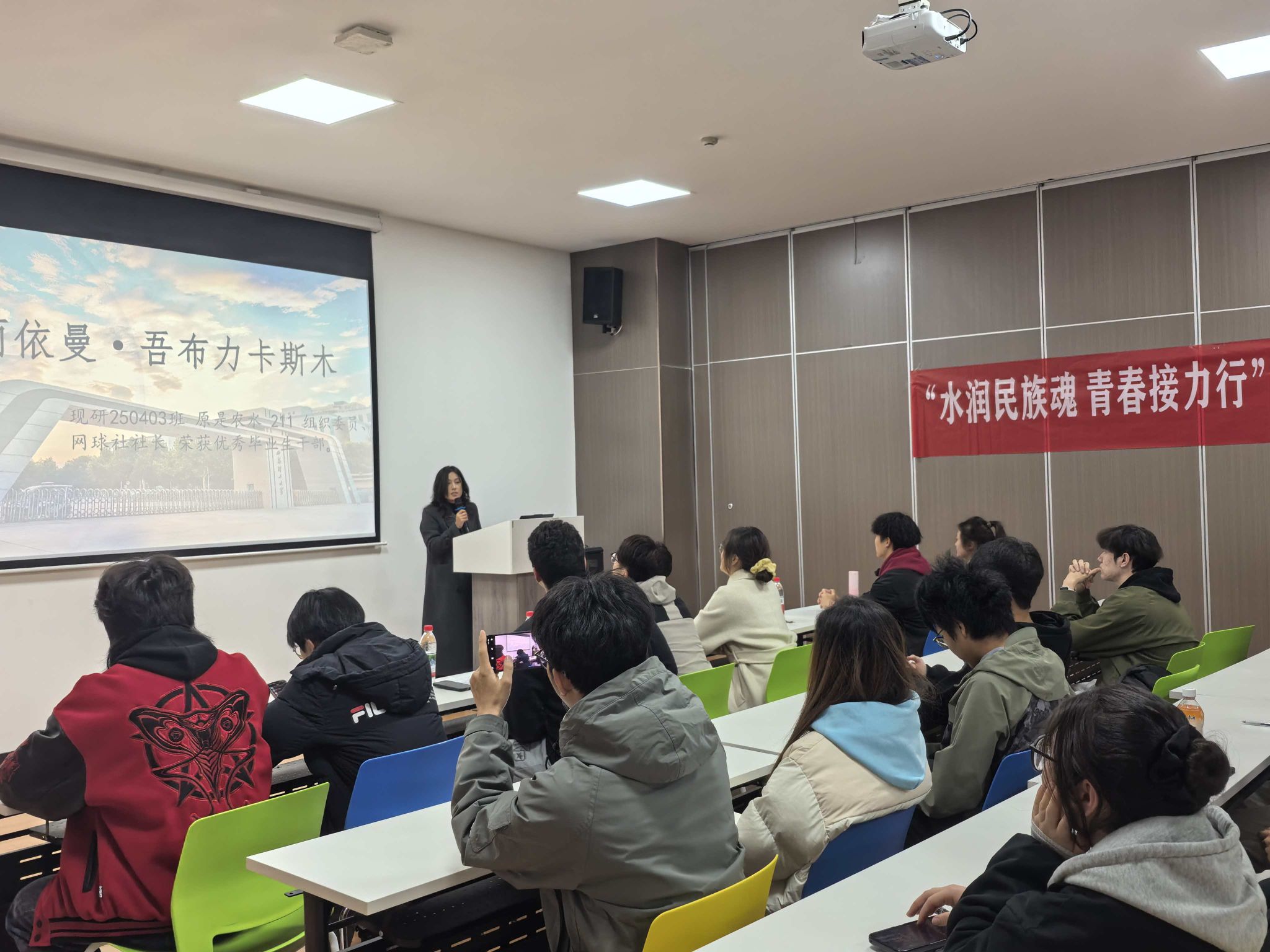 活动邀请到两位优秀少数民族学生进行分享。已成功考取本校研究生的祖丽依曼·吾布力卡斯木结合自身经历,围绕学习方法、时间规划及考研备考进行了细致讲解,鼓励学弟学妹们珍惜时光、打牢基础、勇于追梦。学院学生会主席团成员2023级学生法提柯·叶尔波力从学生骨干视角出发,分享了如何有效平衡学业与工作、在服务同学中锻炼成长的经历。两位学长以朴实真诚的语言传递了奋斗的信念与力量,现场交流互动频繁,气氛融洽热烈。